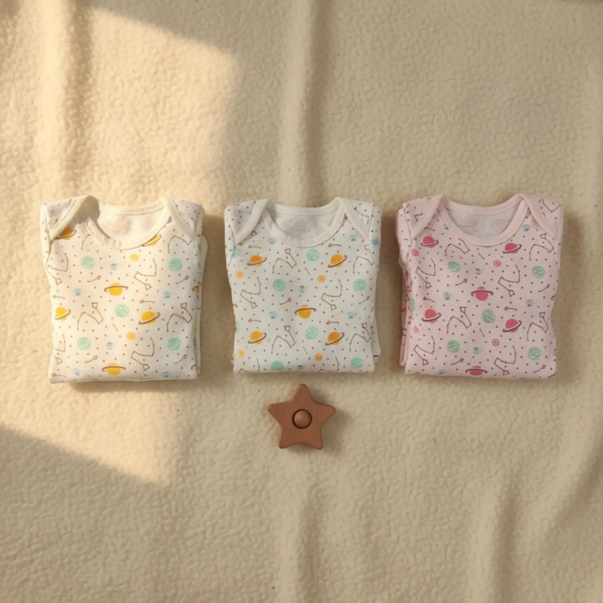 🌌 Embark on a Cozy Celestial Journey: Featuring a subtle and enchanting space-themed print of planets, stars, and constellations in gentle hues of muted green, soft orange, and delicate blue, this bodysuit sparks imagination while maintaining a serene and calming aesthetic. It's the perfect touch of whimsy for your tiny explorer.
